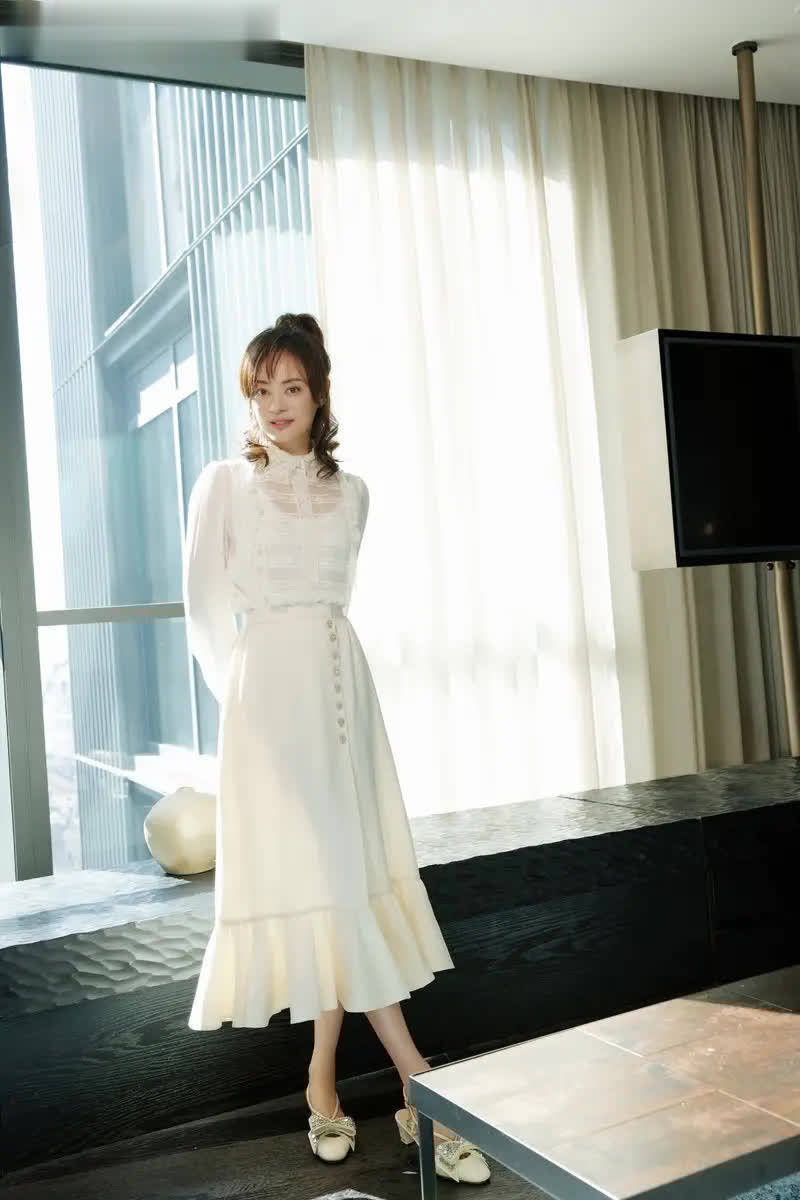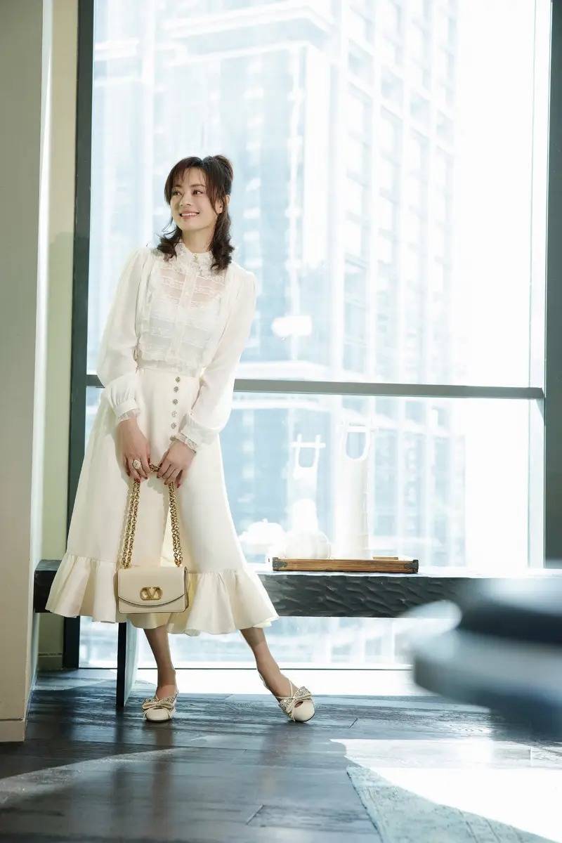 孙俪留长发烫法式微卷,穿荷叶边白裙惊艳减龄!