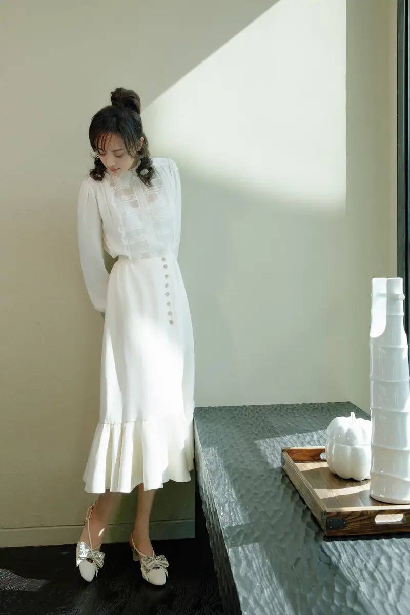 孙俪此次的造型,无论是发型还是服装,都堪称完美。这条白色的荷叶边连衣裙,将她优雅的气质展现得淋漓尽致,再配以收腰的设计,不仅凸显了她纤细的腰身,更是展现出了完美的身材比例,整体看上去浪漫又不失甜美。